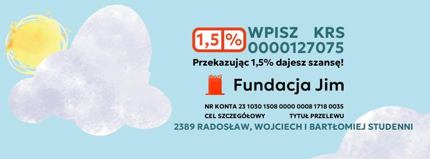 Radosław (14 lat) – autyzm Wojciech (4 lata) – autyzm Bartłomiej (2,5 roku) – całościowe zaburzenie rozwoju, zaburzenia mowy, spectrum autyzmu Proszę o przekazanie 1,5% podatku na leczenie, rehabilitację i terapię moich trzech synów – rodzeństwa z diagnozami ze spectrum autyzmu. Chłopcy wymagają stałej terapii, wsparcia specjalistów oraz pomocy rozwojowej. Chłopcy każdego dnia walczą o samodzielność. Dzięki Państwa wsparciu mogą korzystać z terapii i rehabilitacji, które są niezbędne dla ich rozwoju. Dziękujemy za każdą okazaną pomoc!